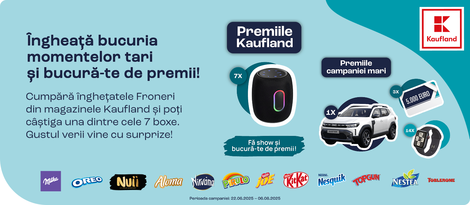 Transformă fiecare zi de vară într-o aventură delicioasă cu înghețatele Froneri! Fie că ai chef de ceva intens și crocant sau de o aromă fresh și răcoritoare, ai zeci de opțiuni care te așteaptă la raft. Și pentru că vara e momentul perfect să creezi amintiri, Froneri te provoacă la un concurs cool: cumpără înghețata ta preferată din Kaufland și poți câștiga una dintre cele 7 boxe JBL. Înscrie-te